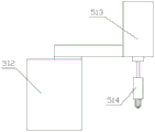 As shown in fig. 18 to 22, the buckle assembling station includes a buckle feeding machine 5, a buckle feeding table 503, a third mechanical arm 501 and a fourth mechanical arm 502, the third mechanical arm 501 includes a fifth servo motor 512, the fifth servo motor 512 is fixedly connected to the workbench 1, the fifth servo motor 512 can drive the third mechanical arm 501 to reciprocate between the buckle feeding table 503 and the positioning block 102, an output end of the fifth servo motor 512 is fixedly connected to a third lifting cylinder 513 vertically arranged downwards, a piston rod end of the third lifting cylinder 513 is fixedly connected to a third mechanical arm 514, the third mechanical arm 514 is provided with a distance sensor, and the distance sensor can detect whether a buckle is clamped on a mechanical arm of the third mechanical arm 501; the third manipulator 514 comprises two third connecting plates 515 which are arranged oppositely, a limiting column 519 is fixedly connected to the outer side of each third connecting plate 515, when the buckles are clamped, the limiting columns 519 can be matched with structures on the buckles to fix the buckles on the buckle feeding table 503, and then the third manipulator 514 clamps the buckles, the limiting columns 519 can prevent the buckles from deflecting during clamping, the accuracy of buckle feeding is ensured, a third driving cylinder 516 is fixedly connected between the third connecting plates 515, the piston rod end of the third driving cylinder 516 is hinged with two third driving rods 517, one end of each third driving rod 517 is hinged with a third clamping jaw 518, and the middle part of each third clamping jaw 518 is rotatably connected between the third connecting plates 515; the fourth mechanical arm 502 comprises a sixth servo motor 520, the sixth servo motor 520 is fixedly connected to the workbench 1, the output end of the sixth servo motor 520 is fixedly connected with a fourth lifting cylinder 521 which is vertically and downwardly arranged, and the piston rod end of the fourth lifting cylinder 521 is fixedly connected with a pressing cylinder 522; when the buckle is needed, a piston rod of the third driving cylinder 516 extends out, the third clamping jaw 518 is closed and clamps the buckle between the third clamping jaw 518, the buckle is moved to the position above the plug connector body on the positioning block under the driving of the third clamping jaw 518 by the fifth servo motor 512 and the third lifting cylinder 513, then the sixth servo motor 520 and the fourth lifting cylinder 521 drive the pressing cylinder 522 to press the buckle into the plug connector body, then the piston rod of the third driving cylinder 516 contracts, and the third clamping jaw 518 releases the buckle.