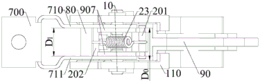 另一种方案是调整现有操作结构的四连杆结构来增大开距。由于四连杆结构中各连杆运动时的关联性高,如果触头支持带动动触头的断开时转动更大的角度,则跳扣、上连杆也需要转动更大的角度,而跳扣的旋转角度又与锁扣、手柄直接关联,导致手柄、锁扣需要旋转更大的角度,对空间提出了更高的要求。此外,与跳扣适配的弹簧的长度、位置和弹力等都发生变化,跳扣转动更大的角度还会使整个机构的运动速度变慢。