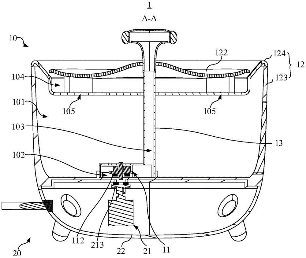As shown in fig. 3, the reservoir chamber 101 and the pump chamber 102 may be open to the first housing 12. Alternatively, a side of the first housing 12 away from the rotation member 11 is formed with a liquid containing space 104 away from the liquid storage chamber 101 and a communication hole 105 communicating with the liquid containing space 104. For example, the top of the first housing 12 facing away from the reservoir 101 may form a liquid containing space 104 and a communication hole 105 communicating with the liquid containing space 104. The liquid containing space 104 may communicate with the liquid storage chamber 101 through the communication hole 105. The body 10 may further include a filter (not shown). The filtering piece is used for filtering the liquid flowing into the liquid storage cavity 101 from the liquid containing space 104 through the communication hole 105, so that the water quality is improved, and the pollution is reduced. For example, the filter may be provided in the liquid containing space 104 and cover the communication hole 105. A liquid containing tray 122 spaced from the bottom of the liquid containing space 104 may be further disposed in the liquid containing space 104.