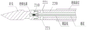 进一步地,请参阅图6,在空心针管220靠近针尖的一端设有灌注孔221,空心针管220的内部通道通过灌注孔221与外界连通,导电性流体通过灌注孔221流出以填充针尖与人体组织间的间隙,以加强针尖与人体组织的电接触性能、防止出现火花放电,并且该导电性流体还有利于电场分布更均匀。Further, please refer to FIG. 6 , a