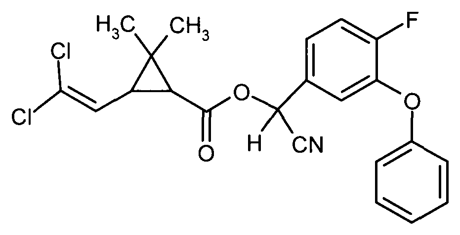 - KAATUXNTWXVJKI-QPIRBTGLSA-N [(s)-cyano-(3-phenoxyphenyl)methyl] 3-(2,2-dichloroethenyl)-2,2-dimethylcyclopropane-1-carboxylate Chemical compound CC1(C)C(C=C(Cl)Cl)C1C(=O)O[C@H](C#N)C1=CC=CC(OC=2C=CC=CC=2)=C1 KAATUXNTWXVJKI-QPIRBTGLSA-N 0.000 claims description 6