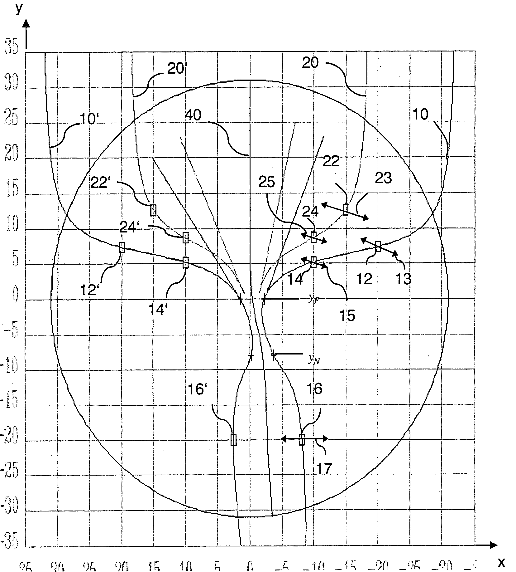 - den horizontalen Abstand von der Hauptlinie eines Punktes (uG(y), y) auf der abgeänderten Basis-Sollisoastigmatismuslinie