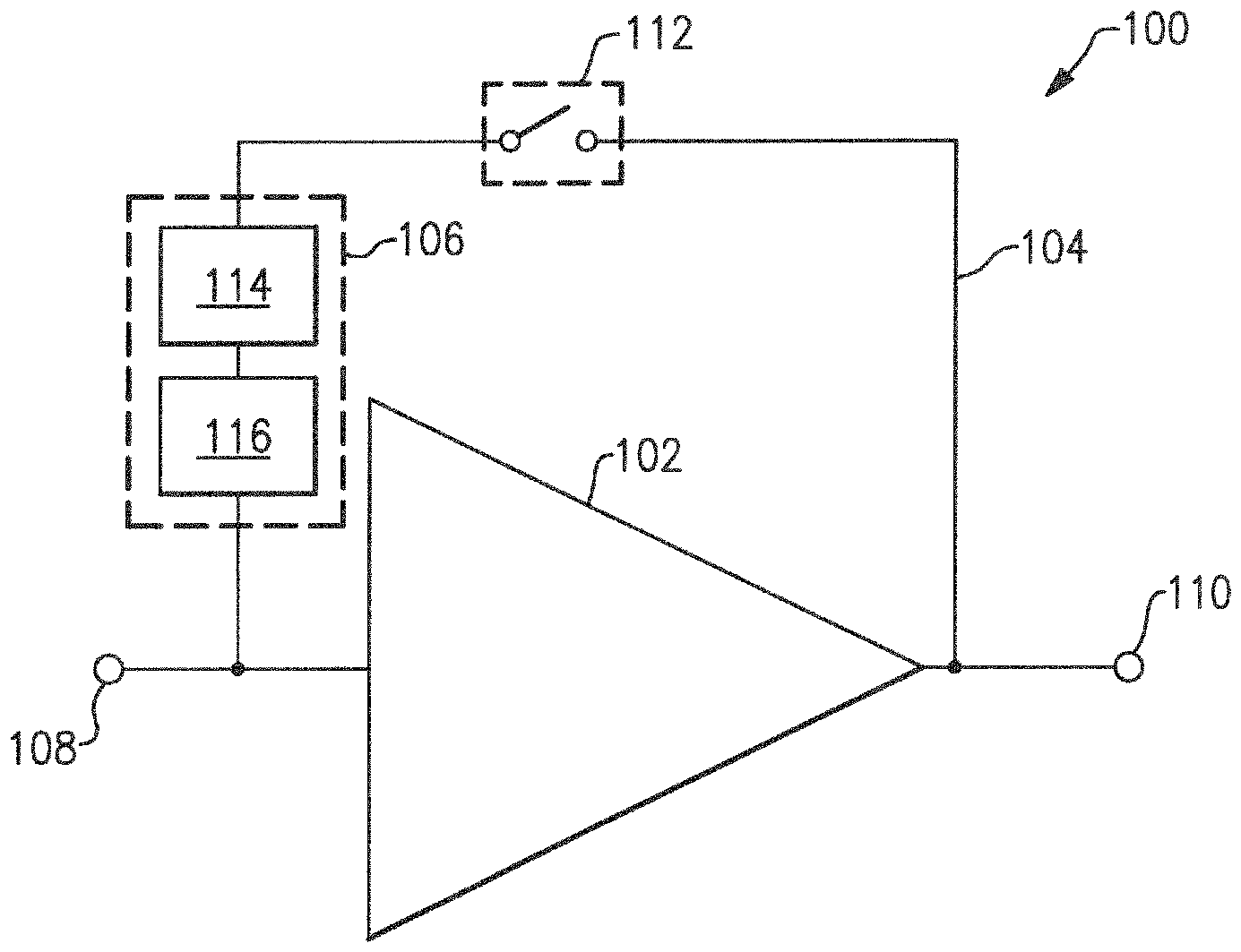 Der Verstärker 102 ist so positioniert, dass er ein Signal an dem Signaleingang 108 empfängt und ein verstärktes Signal an dem Signalausgang 110 erzeugt. In vielen der hier beschriebenen Beispiele ist das Signal ein Hochfrequenzsignal. Dementsprechend kann der Verstärker 102 ein rauscharmer Verstärker, ein Leistungsverstärker oder ein Hochfrequenzverstärker sein, um nur einige Beispiele zu nennen. In einem bestimmten Beispiel ist der Verstärker 102 ein Hochfrequenzverstärker, der innerhalb eines Front-End-Empfangspfades eines drahtlosen Geräts, wie beispielsweise eines Smartphones oder Tablets, gekoppelt ist. In einem solchen Beispiel kann der Verstärker 102 das Signal am Signaleingang 108 von einer Antenne oder einer oder mehreren mit einer Antenne gekoppelten Schaltkomponenten empfangen und das verstärkte Signal an dem Signalausgang 110 an einem Hochfrequenz-Sender/Empfänger bereitstellen. Andere Beispiele sind jedoch nicht so beschränkt, und in anderen Implementierungen kann der Verstärker 102 eine andere Art von Verstärker sein, und insbesondere kann er ein anderer Verstärker als ein Hochfrequenzverstärker (z.B. ein Audioverstärker) sein.The amplifier 102 is positioned so that it has a signal at the signal input 108 receives and an amplified signal at the signal output 110 generated. In many of the examples described here, the signal is a radio frequency signal. Accordingly, the amplifier 102 a low noise amplifier, a power amplifier or a high frequency amplifier, to name just a few examples. In one particular example, the amplifier is 102 a radio frequency amplifier coupled within a front end reception path of a wireless device such as a smartphone or tablet. In such an example, the amplifier 102 the signal at the signal input 108 received by an antenna or one or more switching components coupled to an antenna and the amplified signal at the signal output 110 on a high-frequency transmitter / receiver. However, other examples are not so limited, and in other implementations the amplifier can 102 another type of amplifier, and in particular it can be an amplifier other than a radio frequency amplifier (eg an audio amplifier).