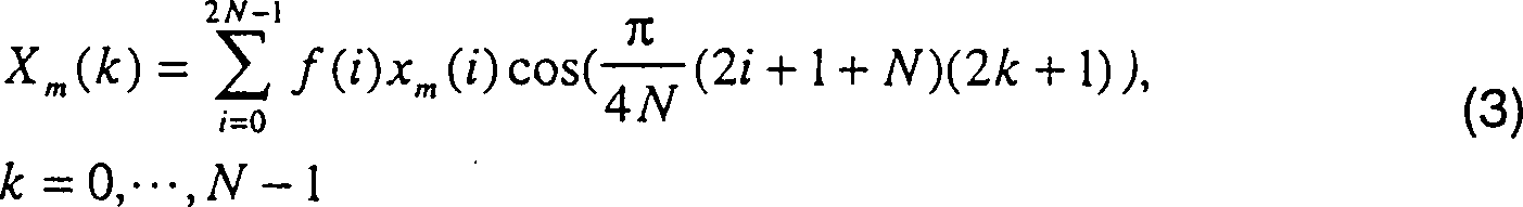 Die Unterbänder sind im MPEG-Standard definiert. Die MDCT in Vorwärtsrichtung ist wie folgt definiert: wobei f(i) das Analyse-Synthese-Fenster ist, bei dem es sich um ein symmetrisches Fenster handelt, so dass ein Additions-Überlappungs-Effekt die Einheitsverstärkung für das Signal erzeugt.The subbands are defined in the MPEG standard. The forward MDCT is defined as follows: where f (i) is the analysis-synthesis window, which is a symmetric window, such that an add-overlap effect produces the unity gain for the signal.