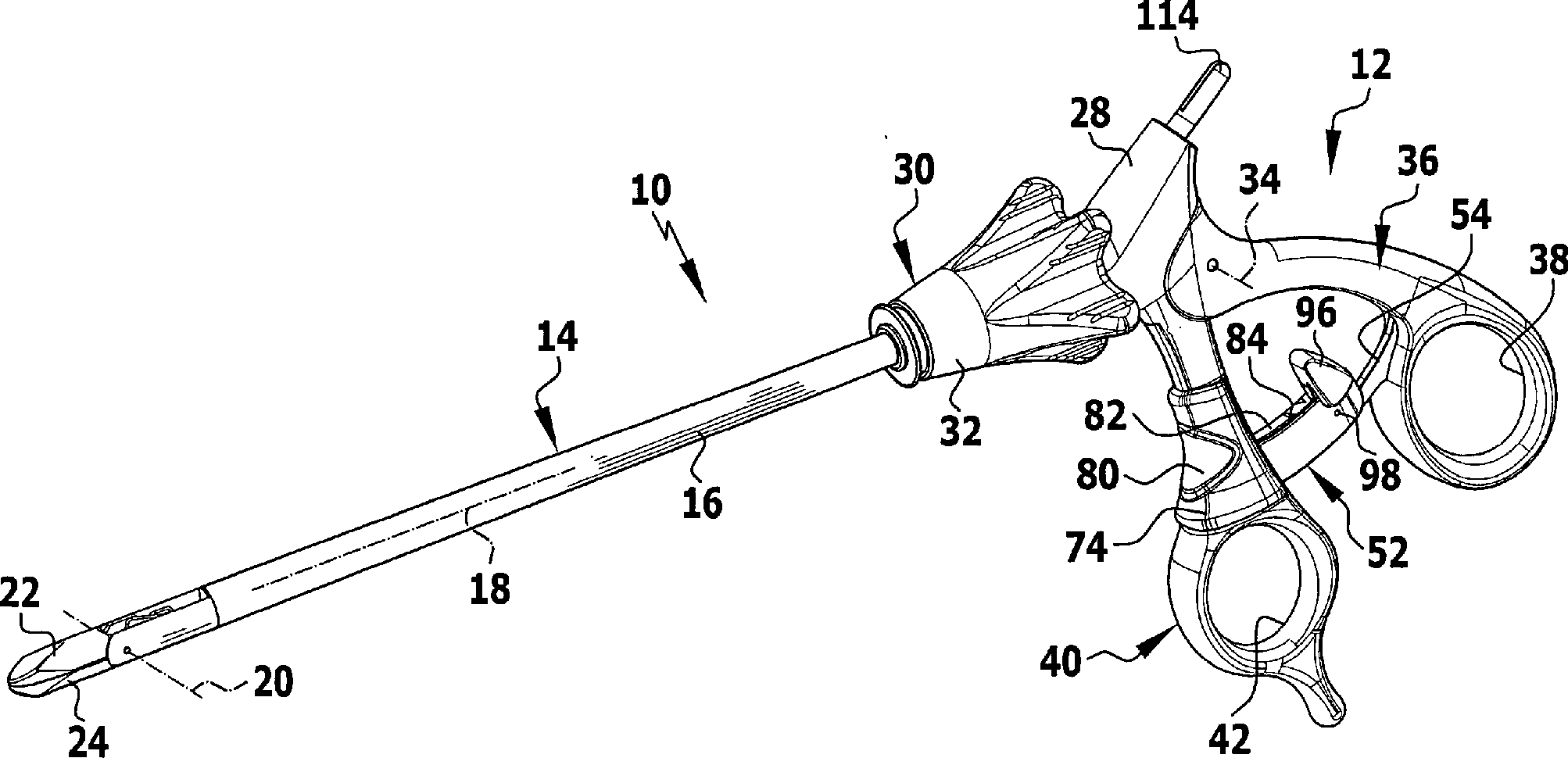 Grundsätzlich wäre es denkbar, das zweite Betätigungselement längs einer geradlinigen Bahn verschiebbar anzuordnen. Besonders einfach wird der Aufbau des Instrumentengriffs jedoch dadurch, dass das zweite Betätigungselement um eine vierte Schwenkachse schwenkbar gelagert ist.In principle, it would be conceivable the second actuator along one slidably arrange rectilinear path. Especially easy is the Structure of the instrument handle, however, characterized in that the second actuator is mounted pivotably about a fourth pivot axis.