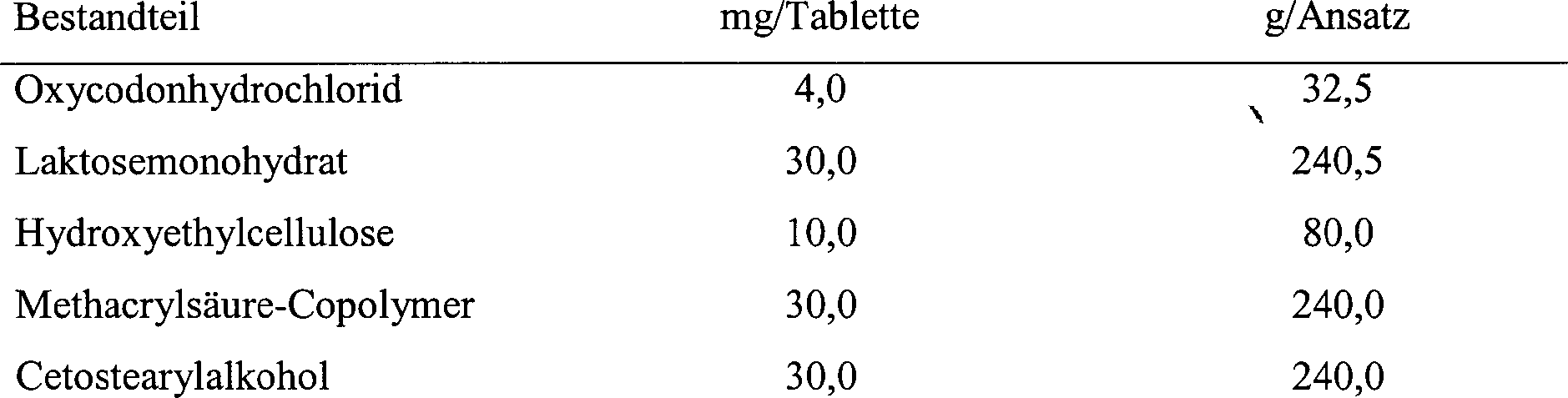In der vorliegenden Beschreibung bedeutet "im wesentlichen pH-unabhängig", dass die Differenz zwischen der Menge an freigesetztem Oxycodon bei, z.B., pH 1,6 und die freigesetzte Menge bei jedem anderen pH, z. B. pH 7,2 (gemessen in vitro unter Verwendung der USP Blattrührer(Paddle)-Methode bei 100 UPM in 900 ml wässrigem Puffer), zu jeder beliebigen Zeit 10 Gew.-% oder weniger beträgt. Die freigesetzten Mengen stellen in allen Fällen einen Mittelwert aus mindestens drei Experimenten dar.In In the present specification, "substantially pH-independent" means that the difference between the amount of released oxycodone at, for example, pH 1.6 and the amount released at any other pH, e.g. B. pH 7.2 (measured in vitro using the USP paddle method at 100 UPM in 900 ml aqueous Buffer) at any time is 10% by weight or less. The released quantities always represent an average of at least three experiments.