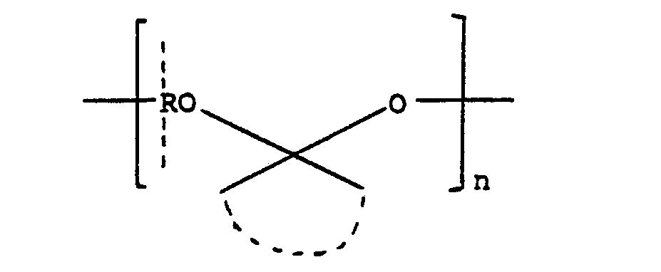- the hydrophobic polymer A may be a polyacetal of the general formula: wherein R is a hydrocarbon radical, represents two alkyl radicals or a cycloalkyl ring, and n is an integer, or a polycarbonate or polyorthoester of the general formula: wherein R is a hydrocarbon radical, the arcuate dotted line represents a hydrocarbon linking group and n is z an integer, as described in United States Patent Number 4,093,709, or it may be a copolymer comprising such acetal, carbonate, or ortho-ester units alternating with diol units, or it may be a copolymer of the formula: which is obtained by reacting pentaerythritol with ketene to form 3,9-bis(methylene)-2,4,8,10-tetraoxa- spiro[5,5]undecane which is then copolymerised with a diol HO-R-OH, as described in Journal of Polymer Science,