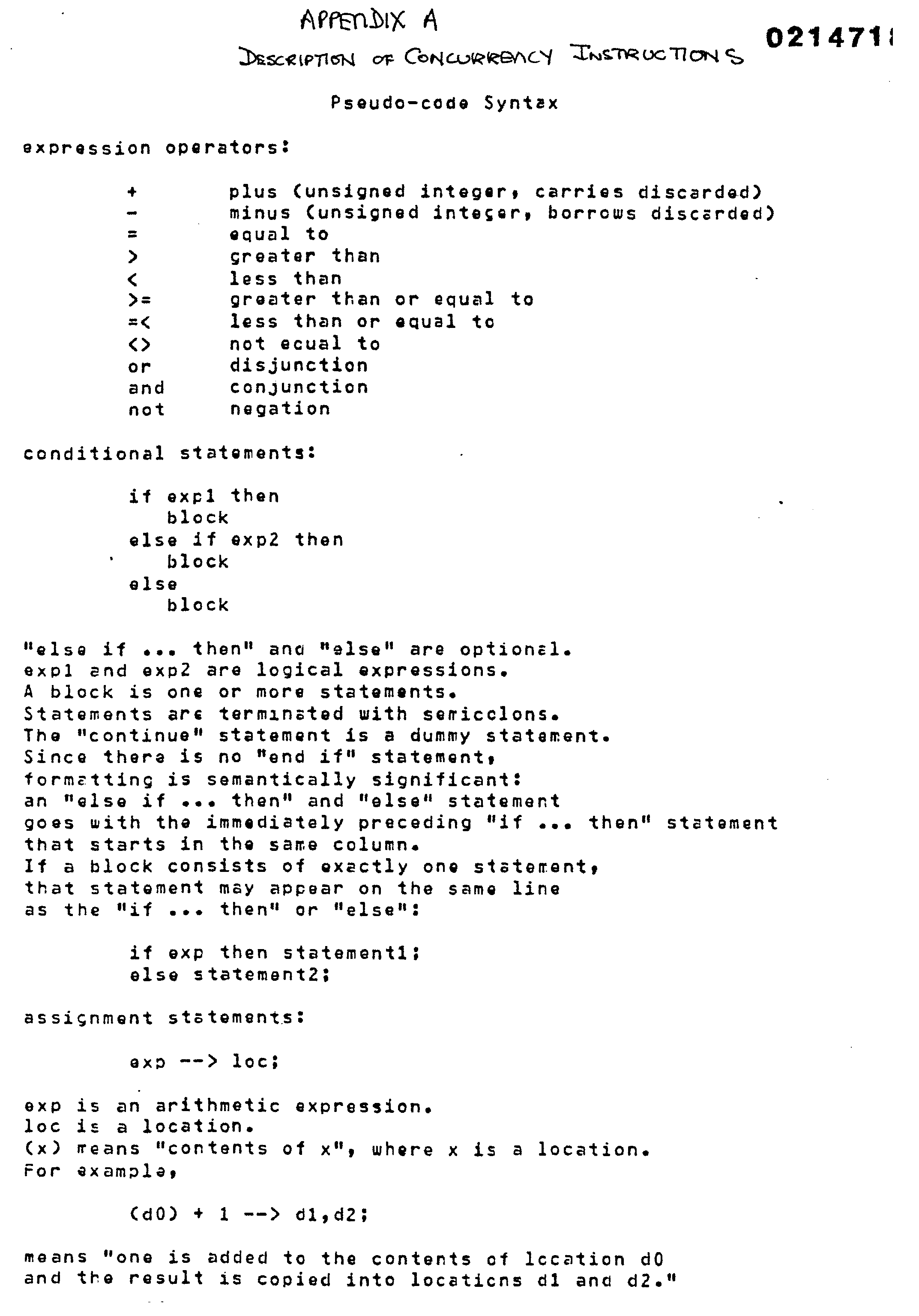- a common data bus extends between the processors for transferring state information such as the stack pointer between processors at the start of concurrent processing; the concurrency control lines extending between processors include the ready lines, lines for passing signals such as the advance-register signals for the synchronization registers, and lines for informing the processors of the initiation and conclusion of concurrent processing.