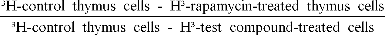 - the comitogen-induced thymocyte proliferation procedure was used as an in vitro measure of the immunosuppressive effects of representative compounds. Briefly, cells from the thymus of normal BALB/c mice were cultured for 72 hours with PHA and IL-1 and pulsed with tritiated thymidine during the last six hours. Cells are cultured with and without various concentrations of rapamycin, cyclosporin A, or test compound. Cells are harvested and incorporated; radioactivity is determined. Inhibition of lymphoproliferation is assessed in percent change in counts per minute from non-drug treated controls. The results are expressed by the following ratio: 3H-control thymus cells - H3-rapamycin-treated thymus cells 3H-control thymus cells - H3-test compound-treated cells