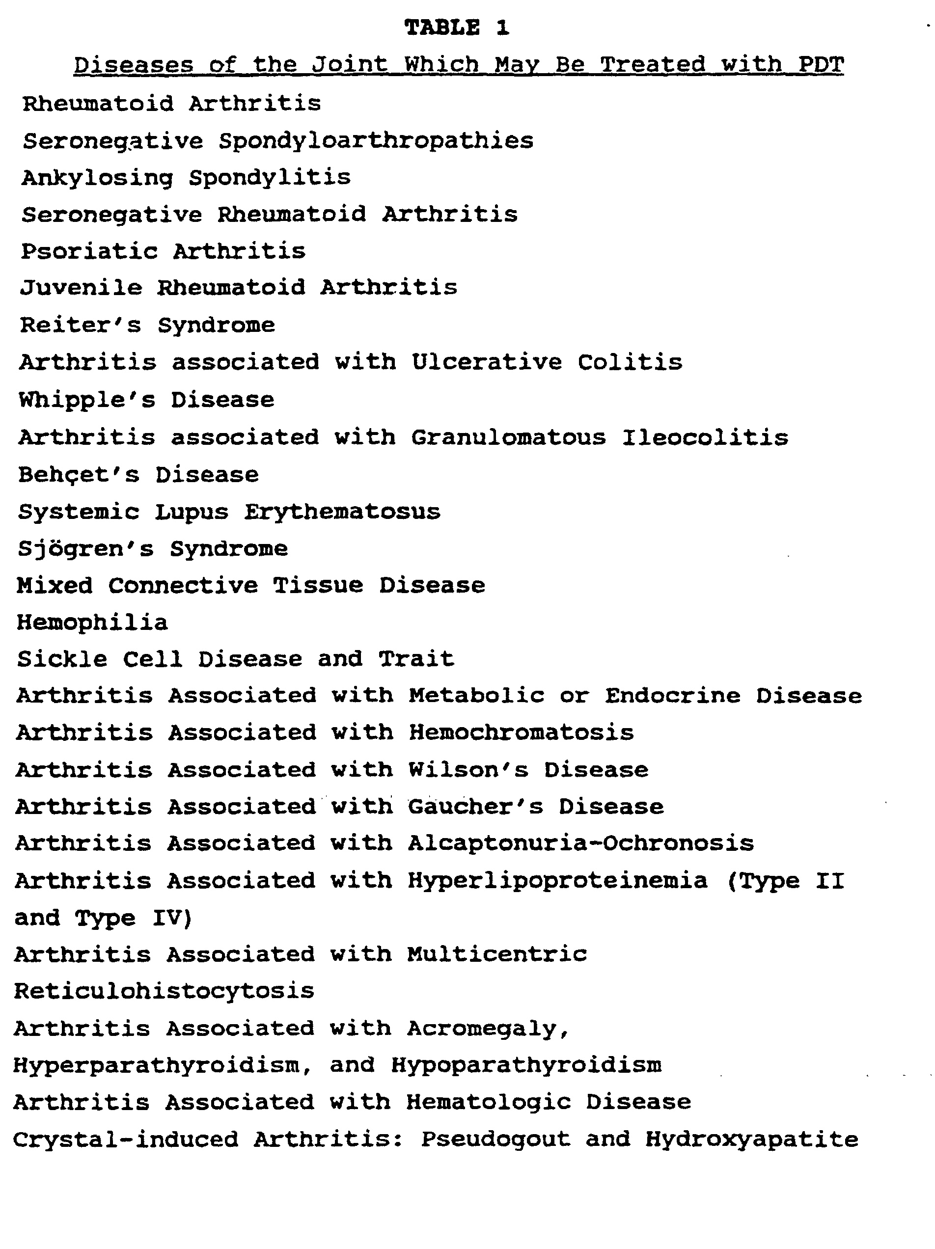 - Light of the appropriate wavelength for a given compound may be administered by a variety of methods known to one skilled in the art. These methods may involve laser, nonlaser, or broad band light and may result in either extracorporeal or intraarticular generation of the light of the appropriate wavelengths. Light used in the invention may be administered using any devices which generates the appropriate wave form including but not limited to fiber optic instruments, arthroscopic instruments or instruments which provide transillumination.