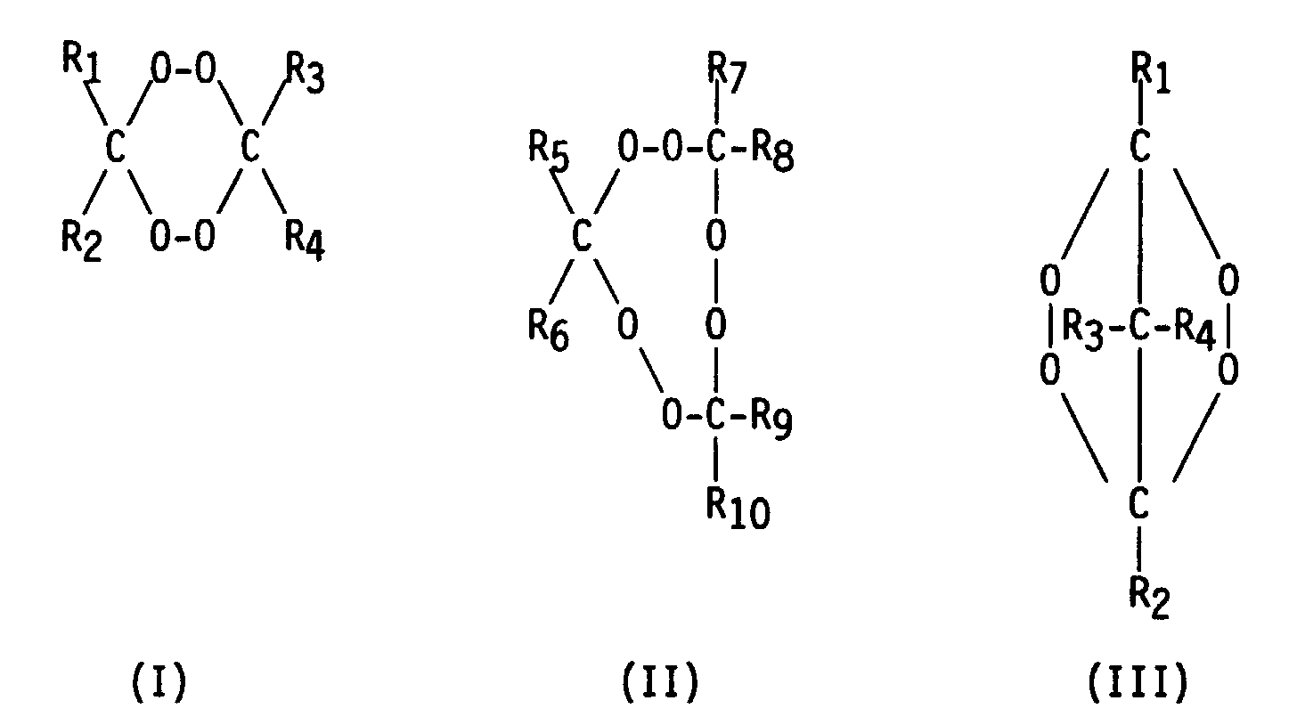 - Examples of preferred peroxides of the formulae I-III for use in accordance with the present invention are the cyclic ketone peroxides derived from acetone, methyl amyl ketone, methylheptyl ketone, methylhexyl ketone, methylpropyl ketone, methylbutyl ketone, diethyl ketone, methylethyl ketone methyloctyl ketone, methylnonyl ketone, methyldecyl ketone, methylundecyl ketone, and mixtures thereof.