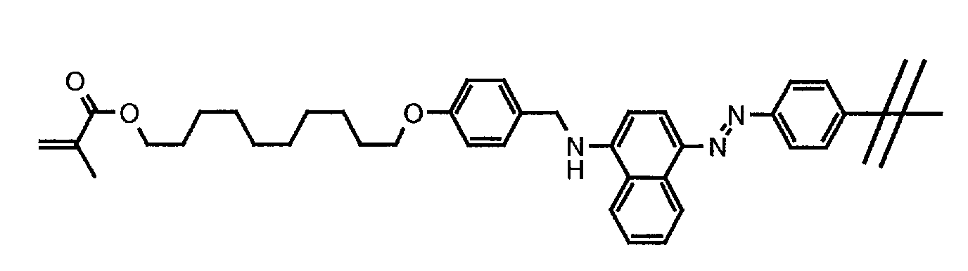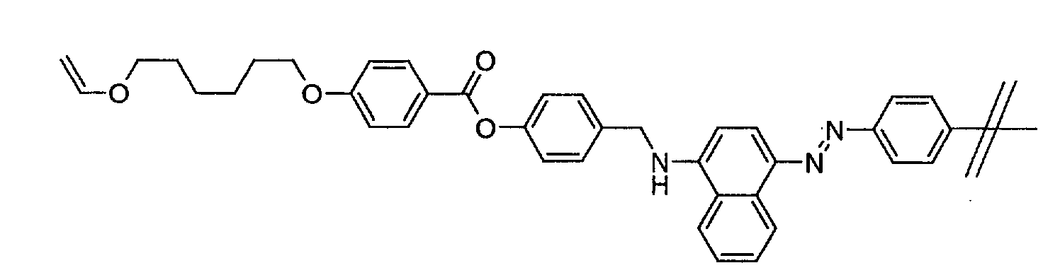 • Coloring power of a dye is expressed by its extinction coefficient ⁇ . It is directly related to the economic viability of a dye. Also, it is of importance especially for the preparation of dye-containing mesogenic polymerizable mixtures and their use for the preparation of dichroic polymer networks and gels, as the concentration of the dye in the mesogenic host should be as low as possible in order to avoid a detrimental influence of the dye to the mesogenic properties of the host.