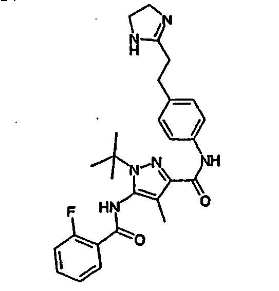 - IHXOBVVDFCDBEC-UHFFFAOYSA-N 4-bromo-3-[(2-chlorobenzoyl)amino]-n-[4-[2-(4,5-dihydro-1h-imidazol-2-yl)ethyl]phenyl]-1h-pyrazole-5-carboxamide Chemical compound ClC1=CC=CC=C1C(=O)NC1=C(Br)C(C(=O)NC=2C=CC(CCC=3NCCN=3)=CC=2)=NN1 IHXOBVVDFCDBEC-UHFFFAOYSA-N 0.000 claims description 4