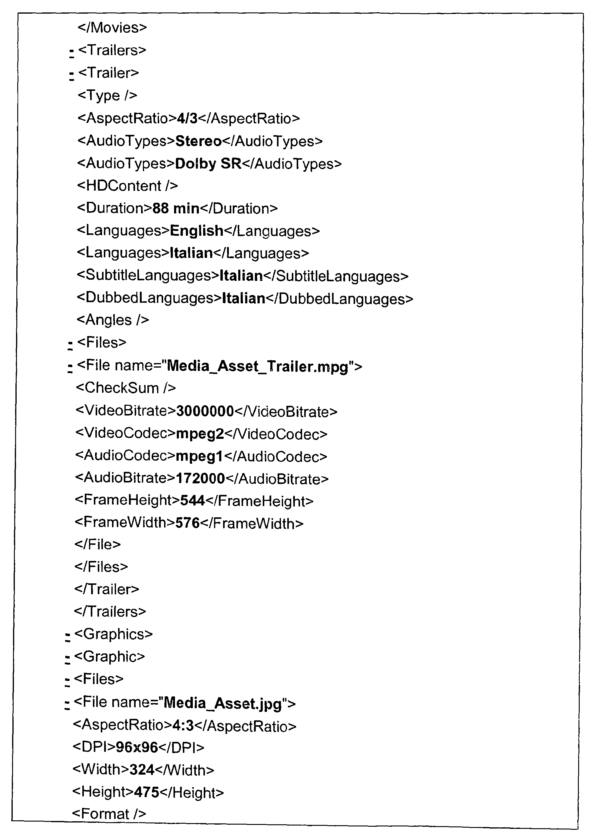 - a movie-asset received from a content provider could be composed of a movie, several trailers, covers, digital and analogue format renditions (i.e., different file formats with accompanying rich media information), and a set of descriptive information such as intellectual property rights, pricing information, actors, writers, title, summary, description, language, dubbed languages, subtitles, and duration of each part.