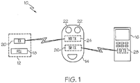 wireless transceiver 26 for bi-directional communication with the operator'spersonal communication device 16 via an internal short-rangewireless transceiver 28. The 26 and 28 may be Bluetooth IEEE 802.11 g/b/a/n, Near Field Communication (NFC), WiFi, or WiMax, for example. Thetransceivers transceivers 20 and 26 effectively create a wireless local area network (WLAN) betweentelematics unit 12 and the Bluetooth, 802.11, NFC, WiFi, WiMax, or equivalently enabledpersonal communication devices 16. In this capacity,fob 14 operates to relay information between thevehicle telematics unit 12 and thepersonal communication device 16. - Communications between