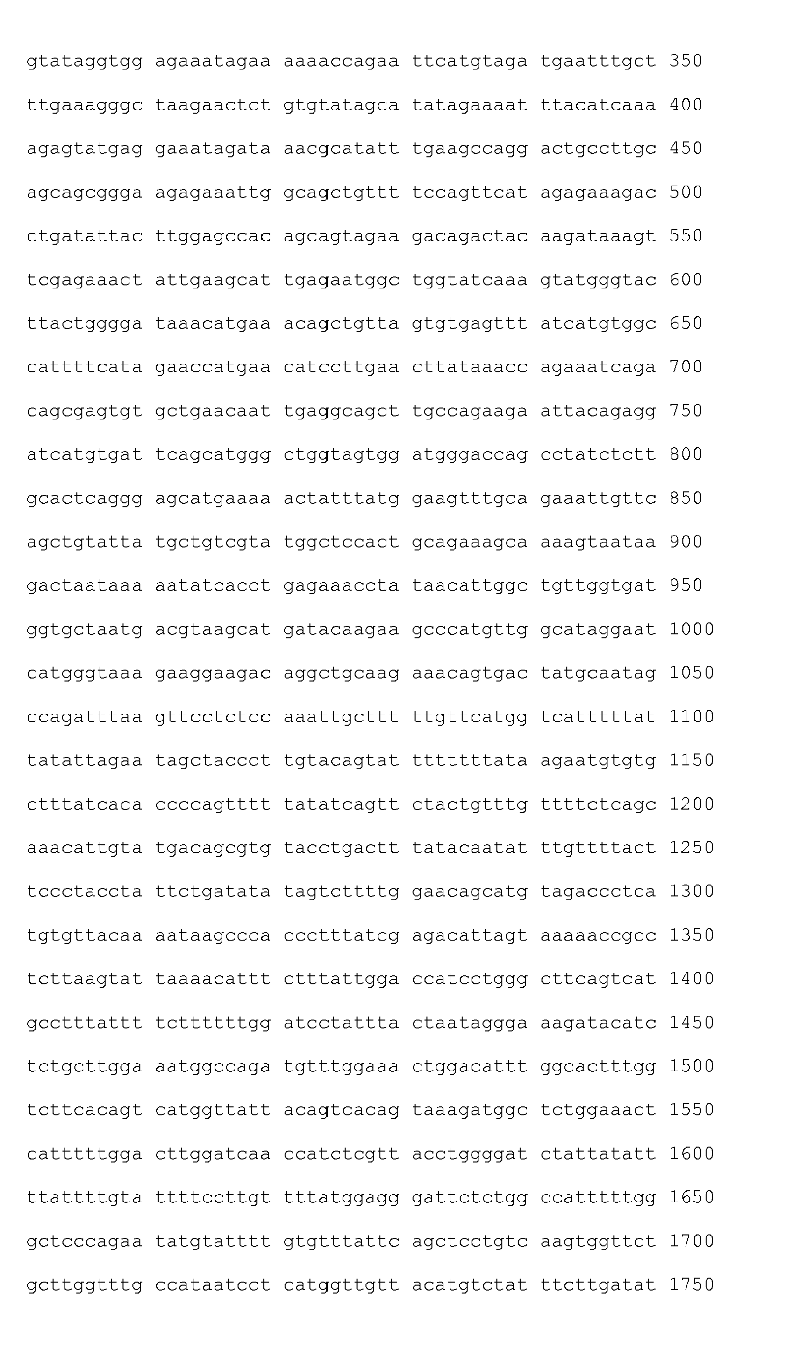 - nucleic acid fragments are usually at least about 5 nucleotides in length, alternatively at least about 6, 7, 8, 9, 10, 11, 12,13, 14, 15, 16, 17, 18, 19, 20, 21, 22, 23, 24, 25, 26, 27, 28, 29, 30, 35, 40, 45, 50, 55, 60, 65, 70, 75, 80, 85, 90, 95, 100, 105, 110, 115, 120, 125, 130, 135, 140, 145, 150, 155, 160, 165, 170, 175, 180, 185, 190, 195, 200, 210, 220, 230, 240, 250, 260, 270, 280, 290, 300, 310, 320, 330, 340, 350, 360, 370, 380, 390, 400, 410, 420, 430, 440, 450, 460, 470, 480, 490, 500, 510, 520, 530, 540, 550, 560, 570, 580, 590, 600, 610, 620, 630, 640,