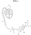 - This device is a device which is used mainly for closing PFO and, as shown in FIGS. 1 , 2 , includes a steering unit at hand 70 provided on the proximal side, a guiding catheter 31 whose proximal end is mounted on the steering unit at hand 70, a catheter 30 provided in the guiding catheter 31, clamping means K which is provided at a distal portion of the catheter 30 and which sandwiches a foramen ovale valve M2 and an atrial septum secundum M1, energy supply means 20 for supplying energy which fuses or joins a biological tissue M (generic term of M1, M2) of a portion sandwiched by the clamping means K, and positioning hold means 60 for performing the surgical procedure by the clamping means K stably and also accurately.