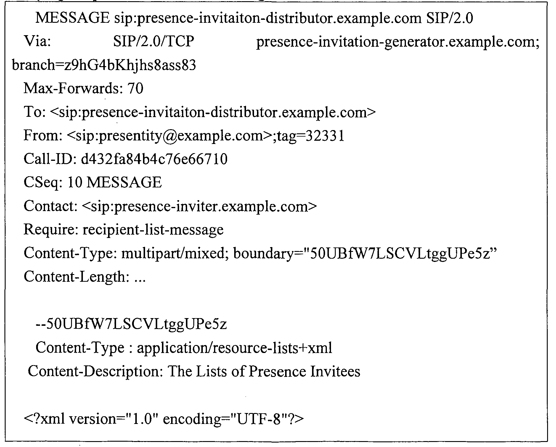 - the content-type of the presence invitation message can be "application/presence-invitation+xml”.