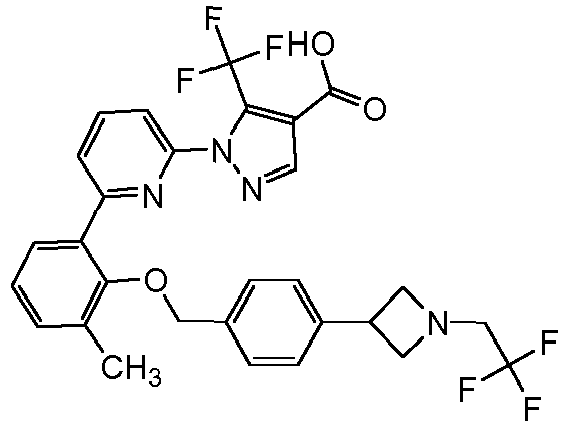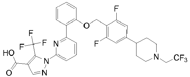 - ZYPVVEMYMMXYQD-UHFFFAOYSA-N OC(c1c(C(F)(F)F)[n](-c2cccc(-c(cccc3)c3OCc3ccc(C4CCN(CC(F)(F)F)CC4)cc3Cl)n2)nc1)=O Chemical compound OC(c1c(C(F)(F)F)[n](-c2cccc(-c(cccc3)c3OCc3ccc(C4CCN(CC(F)(F)F)CC4)cc3Cl)n2)nc1)=O ZYPVVEMYMMXYQD-UHFFFAOYSA-N 0.000 description 1
