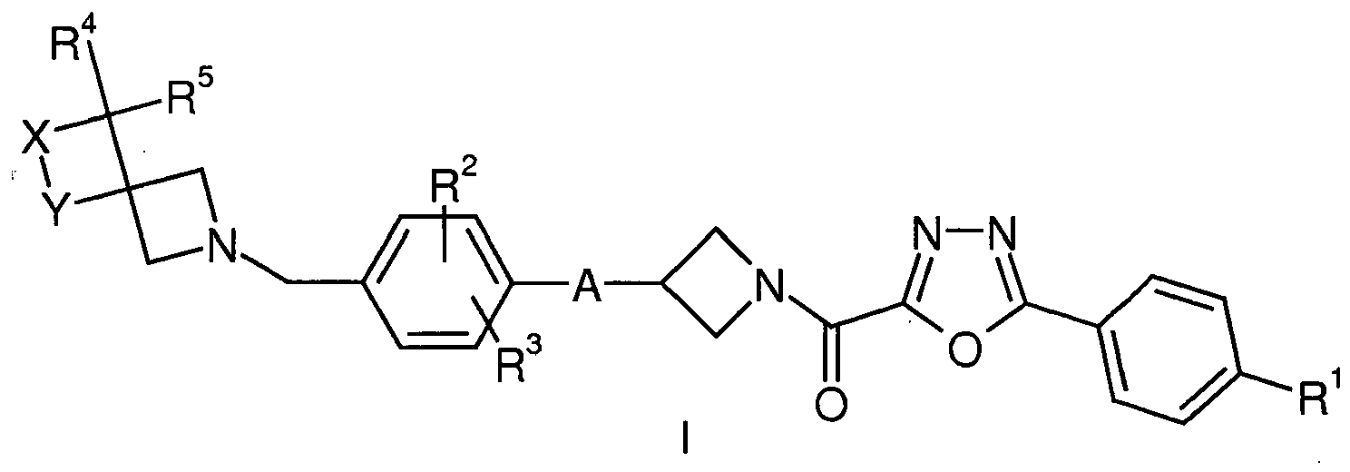 - the present invention relates to certain (3-(4-(1- or 2-oxa-6-azaspiro[3.3]heptan-6-ylmethyl)phenoxy or phenylthio)azetidin-1-yl)(5-phenyl-1,3,4-oxadiazol-2-yl)methanone compounds of formula I, to processes for preparing such compounds and to intermediate compounds used in these processes, to their use in the treatment of a melanin-concentrating hormone related disease or condition for example obesity, obesity-related conditions, anxiety and depression, and to pharmaceutical compositions containing them.