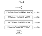- The method of Claim 8, wherein the step d) comprises:detecting a phase inversion region based on the ultrasound data, wherein the phase inversion region is defined when a sound wave is transmitted from a softness medium to a hardness medium, or vice verse;forming the ultrasound images based on the ultrasound image;performing edge detection upon the phase inversion region of the ultrasound images; andperforming an image processing for making prominence upon each of the ultrasound images based on the detected edge.