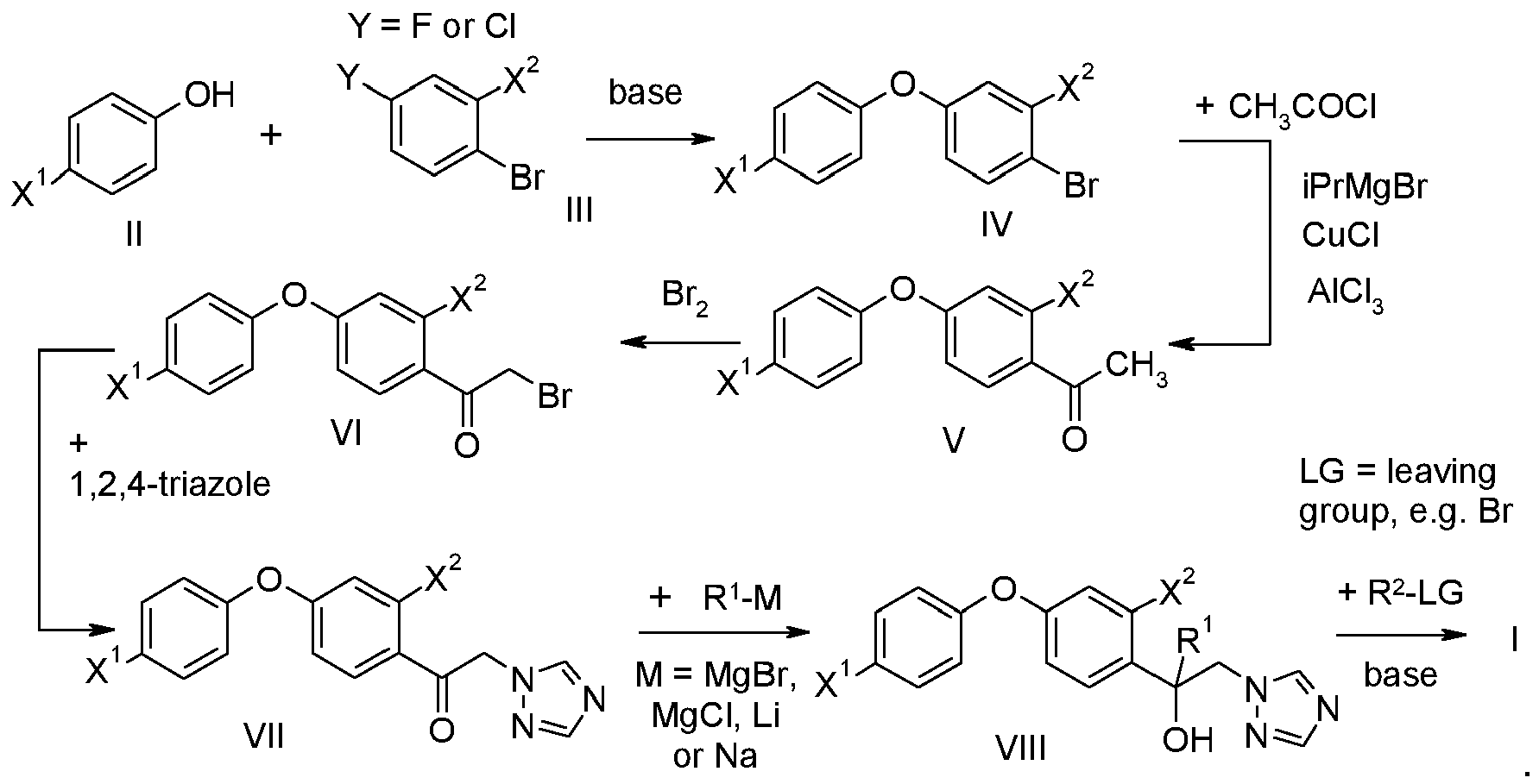 3, LiCl and mixtures thereof, to obtain acetophenones V. These compounds V can be halogenated e.g. with bromine preferably in an organic solvent such as diethyl ether, methyl tert.-butyl ether (MTBE), methanol or acetic acid. The resulting compounds VI can subsequently reacted with 1H-1,2,4-triazole preferably in the presence of a solvent such as tetrahydrofuran (THF), dimethylormamide (DMF), toluene and in the presence of a base such as potassium carbonate, sodium hydroxide or sodium hydride to obtain compounds VII. These triazole compounds VII are reacted with a Grignard reagent R