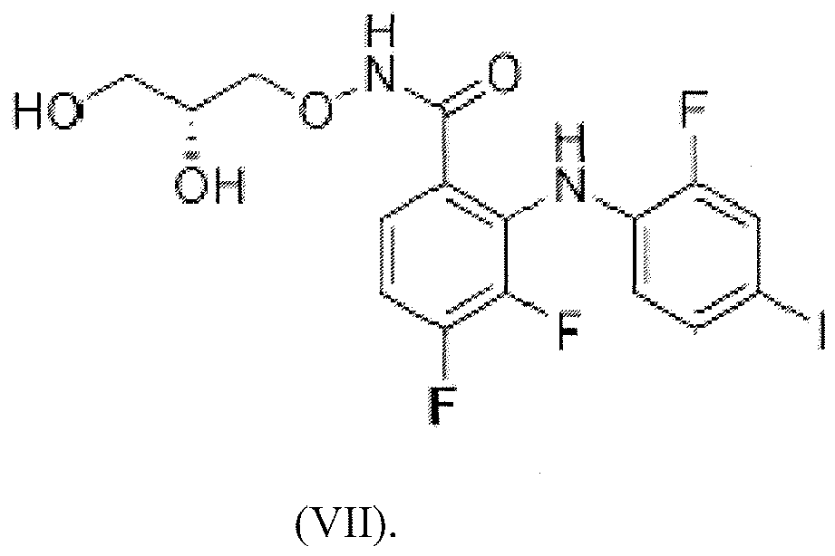 N-[(2R)-2,3-dihydroxypropoxy]-3,4-difluoro-2-[(2-fluoro-4-iodophenyl)amino]-benzamide (PD0325901) as shown in formula (VII) below or a pharmaceutically acceptable salt, solvate or hydrate thereof (commercially available from Selleckchem, Houston, Tx 77054 USA):
