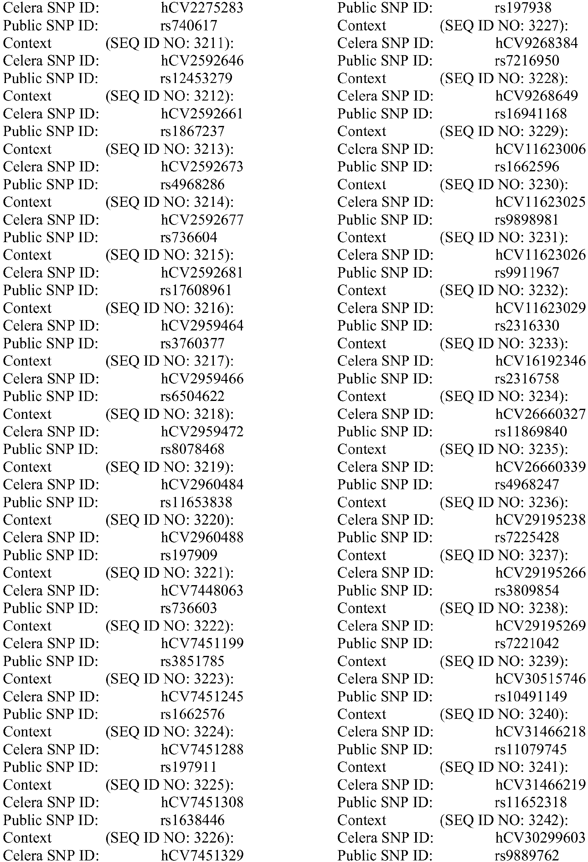 Note that SNP markers may be included in both Table 1 and Table 2; Table 1 presents the SNPs relative to their transcript sequences and encoded protein sequences, whereas Table 2 presents the SNPs relative to their genomic sequences. In some instances Table 2 may also include, after the last gene sequence, genomic sequences of one or more intergenic regions, as well as SNP context sequences and other SNP information for any SNPs that lie within these intergenic regions. Additionally, in either Table 1 or 2 a "Related Interrogated SNP" may be listed following a SNP which is determined to be in LD with that interrogated SNP according to the given Power value. SNPs can be readily cross-referenced between all Tables based on their Celera hCV (or, in some instances, hDV) identification numbers and/or public rs identification numbers, and to the Sequence Listing based on their corresponding SEQ ID NOs.
