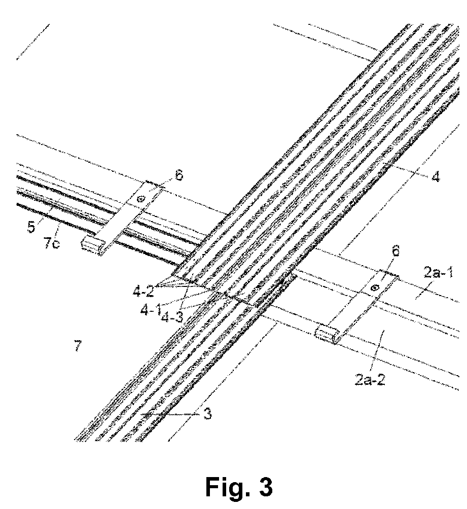 - the two falling side edges (7a) and (7b) of the plate (7) lie on a part of the laterally adjoining joint profiles (3) and (3 '), the upper side (7c) with the collecting trough (5) attached thereto lies on the lower batten part (2a-2) and the lower side of the plate (7d) is located, for example, on the higher batten part (2a-1) fixed further down and / or on the plate fixing element (s) (6).