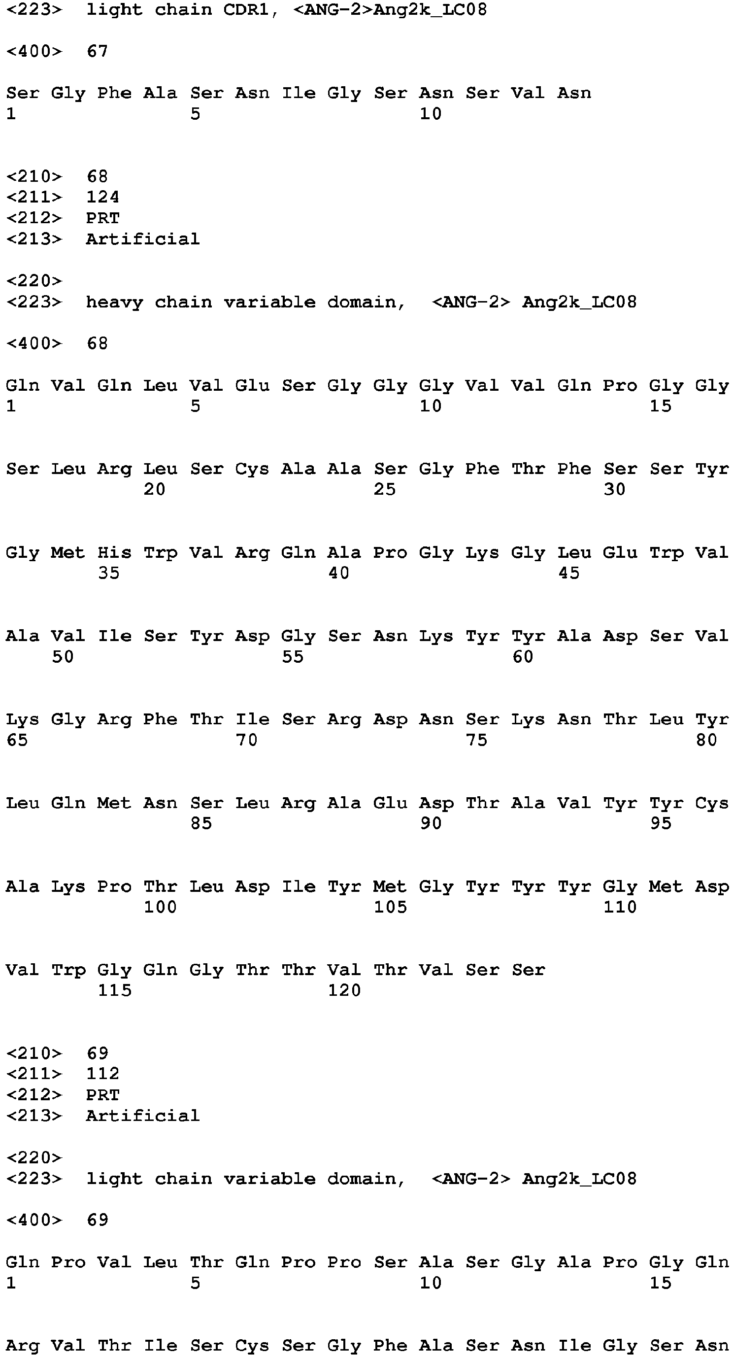 - ANG-2 Human angiopoietin-2 (ANG-2) (alternatively abbreviated with ANGPT2 or ANG2) (SEQ ID No: 106) is described in Maisonpierre, P.C., et al, Science 277 (1997) 55-60 and Cheung,A.H., et al., Genomics 48 (1998) 389-91 .
