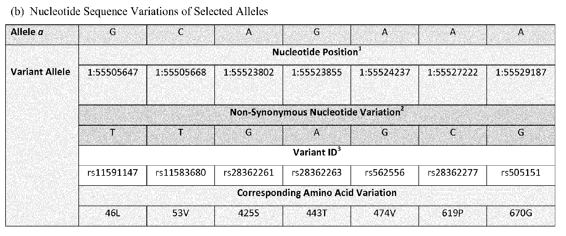 The inventor's selection included, as a consideration, selection for nucleotide variation that produced amino acid variation in corresponding PCSK9 forms (ie, non-synonymous variations), as opposed to silent variations that do not alter amino acid residues in the target protein.