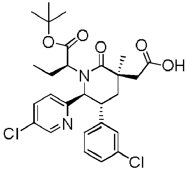 - WAJGPOYWDHBEGQ-TZRGJIPMSA-N CCC([C@@H](C)C(C)(C)O)N(C(C(C[C@]1(C)CC(O)=O)c2cc(Cl)ccc2)c(cc2)ccc2Cl)C1=O Chemical compound CCC([C@@H](C)C(C)(C)O)N(C(C(C[C@]1(C)CC(O)=O)c2cc(Cl)ccc2)c(cc2)ccc2Cl)C1=O WAJGPOYWDHBEGQ-TZRGJIPMSA-N 0.000 description 1
