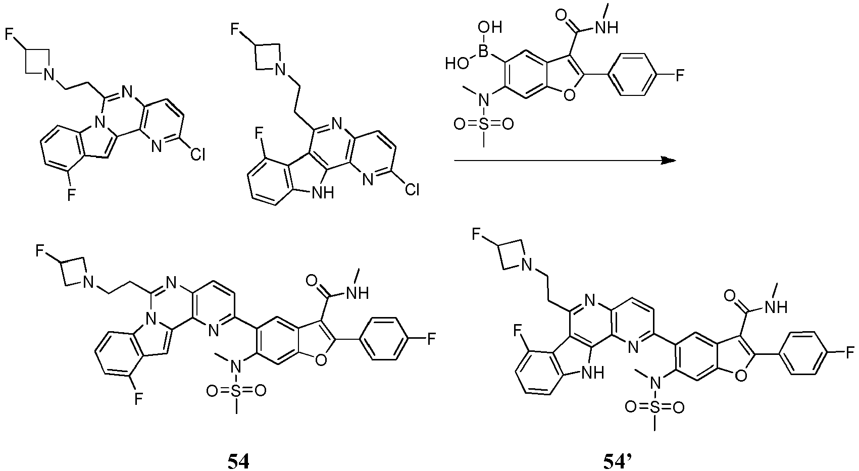 - SLEZTKDBJHBOCT-UHFFFAOYSA-N CNC(c(c1c2)c(-c(cc3)ccc3F)[o]c1cc(N(C)S(C)(=O)=O)c2-c1ncc2nc(CN(C3)CC3(F)F)[n]3c4cccc(F)c4cc3c2c1)=O Chemical compound CNC(c(c1c2)c(-c(cc3)ccc3F)[o]c1cc(N(C)S(C)(=O)=O)c2-c1ncc2nc(CN(C3)CC3(F)F)[n]3c4cccc(F)c4cc3c2c1)=O SLEZTKDBJHBOCT-UHFFFAOYSA-N 0.000 description 1