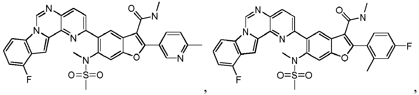 - GFYYQRYEUPVTMI-UHFFFAOYSA-N Cc(nc1)ccc1-c([o]c1c2)c(C(NC)=O)c1cc(-c1ncc3nc[n]4c5cccc(F)c5cc4c3c1)c2N(C)S(C)(=O)=O Chemical compound Cc(nc1)ccc1-c([o]c1c2)c(C(NC)=O)c1cc(-c1ncc3nc[n]4c5cccc(F)c5cc4c3c1)c2N(C)S(C)(=O)=O GFYYQRYEUPVTMI-UHFFFAOYSA-N 0.000 description 1