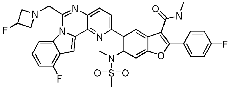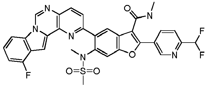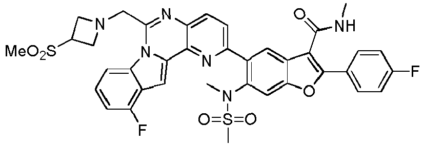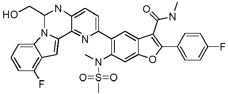 - LBNZZSKUFNYJMO-UHFFFAOYSA-N CNC(c1c(-c(c(F)c2)ccc2F)[o]c(cc2N(C)S(C)(=O)=O)c1cc2-c1ccc2nc(CN3CCN(C)CC3)[n]3c4cccc(F)c4cc3c2n1)=O Chemical compound CNC(c1c(-c(c(F)c2)ccc2F)[o]c(cc2N(C)S(C)(=O)=O)c1cc2-c1ccc2nc(CN3CCN(C)CC3)[n]3c4cccc(F)c4cc3c2n1)=O LBNZZSKUFNYJMO-UHFFFAOYSA-N 0.000 description 1