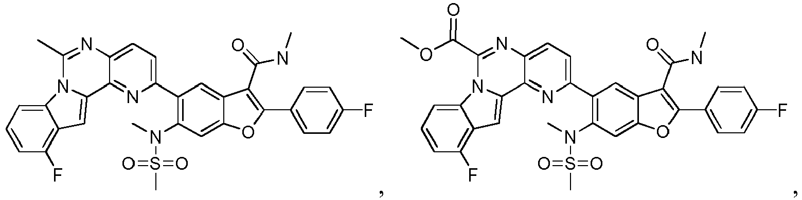 - FNXYNLZKTIKZLC-UHFFFAOYSA-N CNC(c(c1c2)c(-c(cc3)ccc3F)[o]c1cc(N(C)S(C)(=O)=O)c2-c(nc1c2c3)ccc1nc(C(OC)=O)[n]2c1c3c(F)ccc1)=O Chemical compound CNC(c(c1c2)c(-c(cc3)ccc3F)[o]c1cc(N(C)S(C)(=O)=O)c2-c(nc1c2c3)ccc1nc(C(OC)=O)[n]2c1c3c(F)ccc1)=O FNXYNLZKTIKZLC-UHFFFAOYSA-N 0.000 description 1