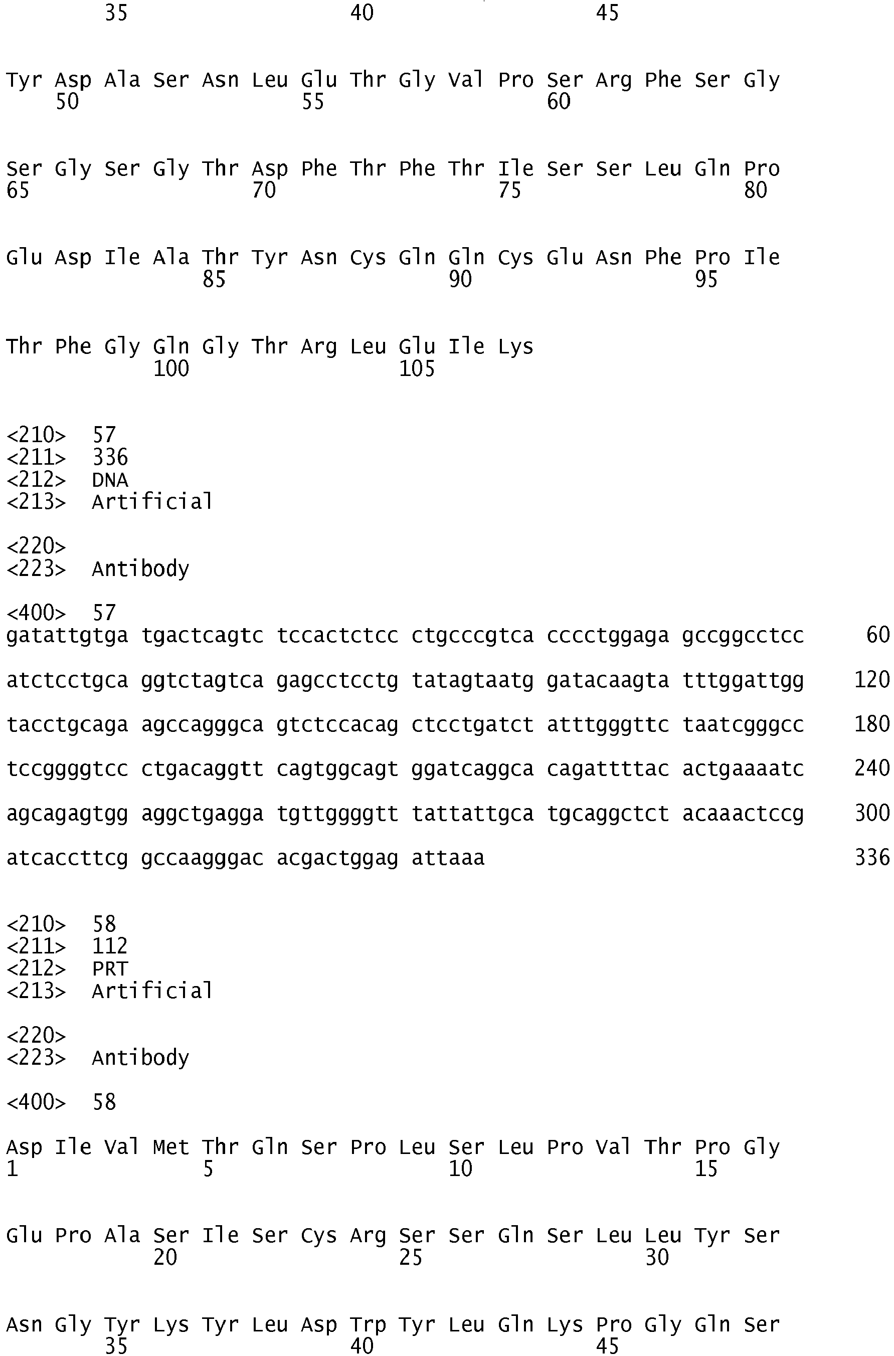- an isolated binding protein of the invention comprises a heavy chain amino acid sequence selected from the group consisting of SEQ ID Nos: 2, 6, 10, 14, 18, 22, 26, 30, 34, 36, 40, 42, 46, 50, 54, 60, 62, 66, 70, 74, 78, 80, 84, 88, 92, 96, 100, 104, 108, 112, 116, 120, 122, 126, 130, 134, 138, 142, 146, 150, 154, 158, 162, 166, 170, 174, 178, 182, 186, 190, 194, 198, 202, 206, 210, 214, 218, 222, 226 and 230, and/or a light chain amino acid sequence selected from the group consisting of SEQ ID NOs: 4, 8, 12, 16, 20, 24, 28, 32, 38, 44, 48, 52, 56, 58, 64, 68, 72, 76, 82, 86, 90, 94, 98, 102, 106
