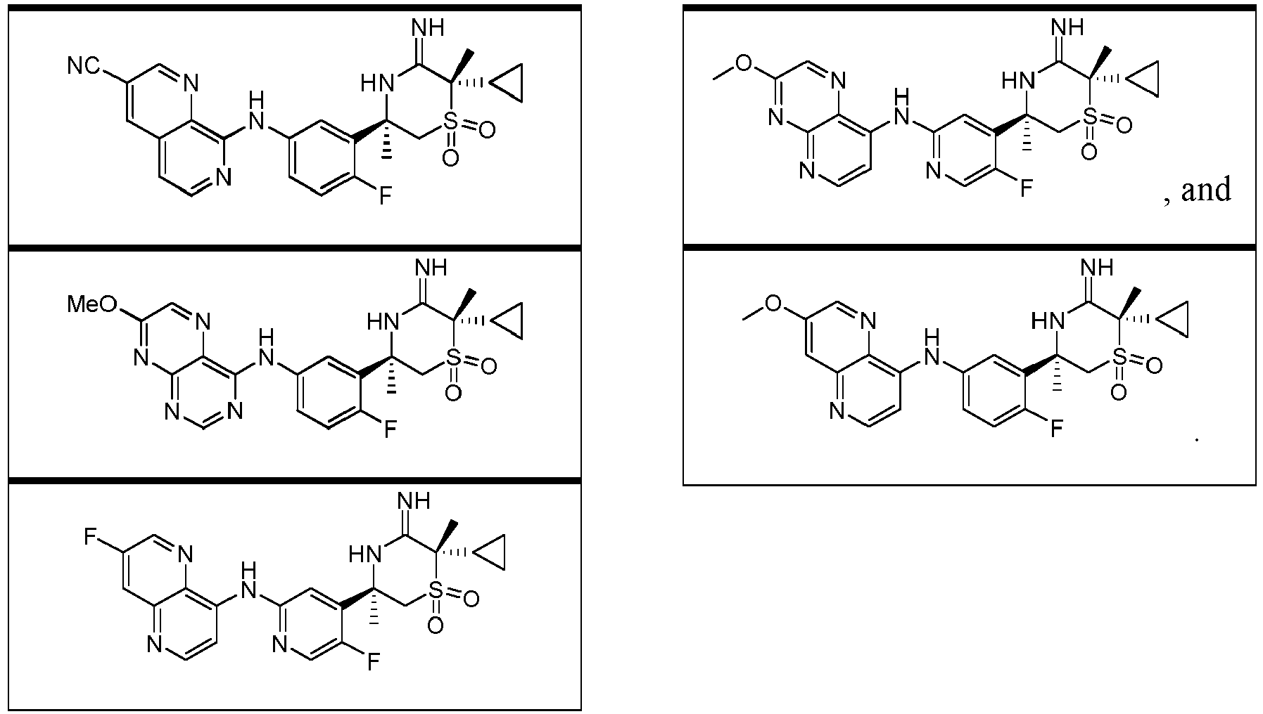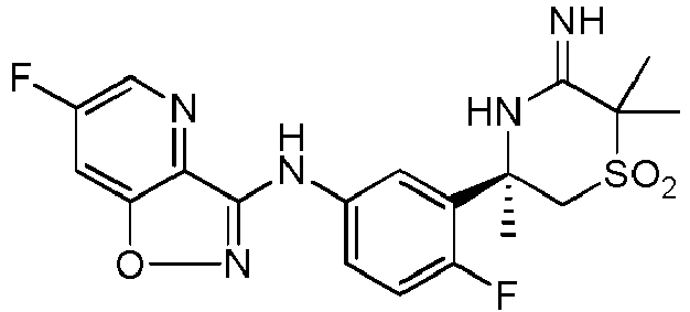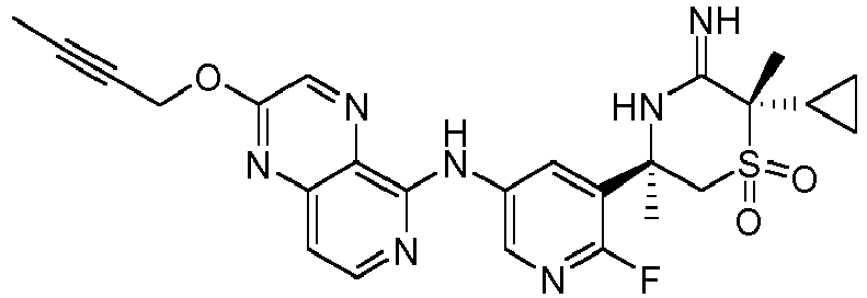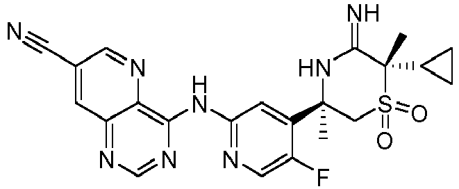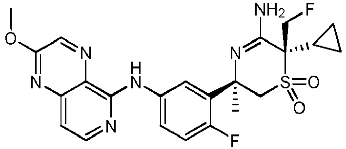 - JPRKRIBITUJGJD-GOTSBHOMSA-N C[C@](CS([C@@]1(C)C2CC2)(=O)=O)(c2cc(Nc3nccc4cc(OC)cnc34)cnc2F)NC1=N Chemical compound C[C@](CS([C@@]1(C)C2CC2)(=O)=O)(c2cc(Nc3nccc4cc(OC)cnc34)cnc2F)NC1=N JPRKRIBITUJGJD-GOTSBHOMSA-N 0.000 description 1
