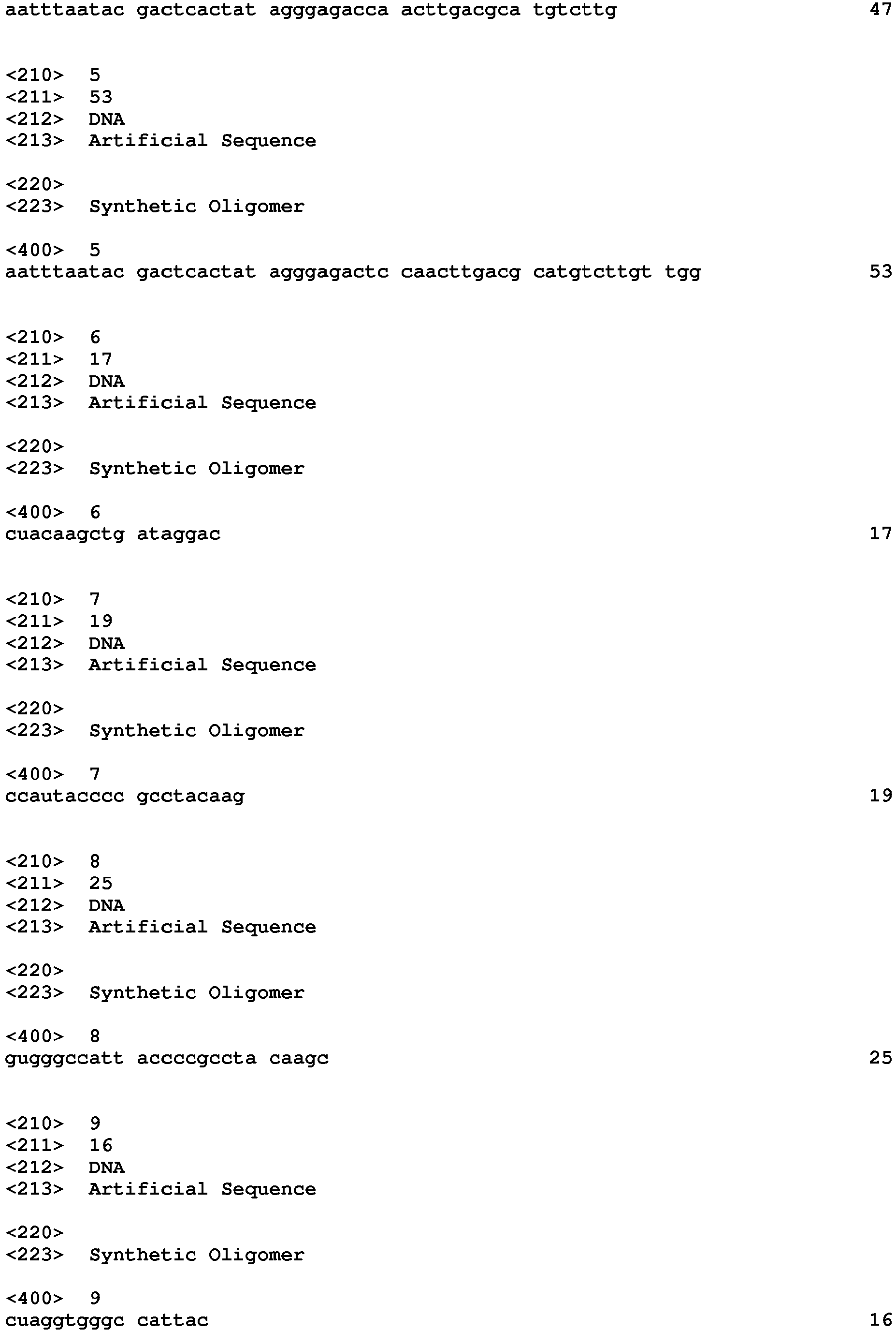 - a terminating oligomer has the sequence shown in SEQ ID NO:11, SEQ ID NO:12, SEQ ID NO:13, SEQ ID NO:14, SEQ ID NO:15, or SEQ ID NO:16.