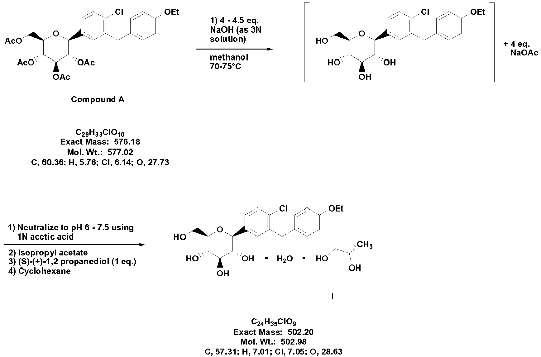- a process for the preparation of the crystalline compound (S)-PG of the structure Ia which includes the steps of providing a compound A (prepared as described in U.S. application Serial No. 10/745,075 filed December 23, 2003 , Examples 17 to 20), of the structure treating compound A with an alcohol solvent such as methanol or ethanol, and aqueous base such as sodium hydroxide, and water, if necessary, under an inert atmosphere, and elevated temperature, if necessary, adding an acid such as hydrochloric acid to neutralize the reaction mixture, to form compound I of the structure and treating the reaction mixture containing compound I with an organic solvent such as methyl t-butyl ether, an alkyl acetate such as ethyl acetate, methyl acetate, isopropyl acetate, or butyl acetate, and (S)-propylene glycol, optionally adding seeds of (S)-PG compound Ia (SC-3) to the mixture, to