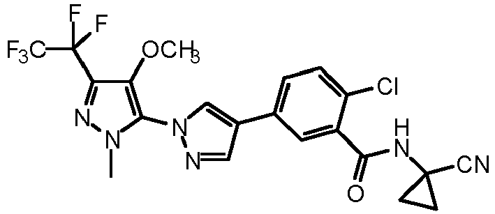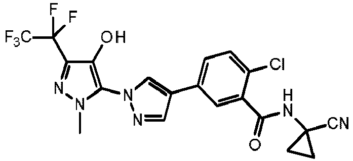 - NWMXOZXDJLIVTE-UHFFFAOYSA-N C[n]1nc(C(C(F)(F)F)(F)F)c(SC2CC2)c1-[n]1ncc(-c(cc2C(NC3(CC3)C#N)=O)ccc2Cl)c1 Chemical compound C[n]1nc(C(C(F)(F)F)(F)F)c(SC2CC2)c1-[n]1ncc(-c(cc2C(NC3(CC3)C#N)=O)ccc2Cl)c1 NWMXOZXDJLIVTE-UHFFFAOYSA-N 0.000 description 2