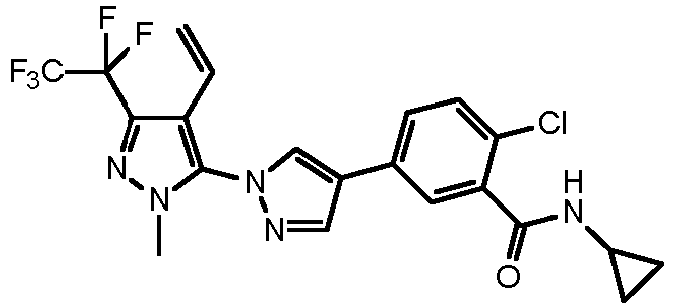 - GKXUIWXRDJHLJB-UHFFFAOYSA-N C[n]1nc(C(C(F)(F)F)(F)F)c(C#C)c1-[n]1ncc(-c(cc2)cc(C(NC3CC3)=O)c2Cl)c1 Chemical compound C[n]1nc(C(C(F)(F)F)(F)F)c(C#C)c1-[n]1ncc(-c(cc2)cc(C(NC3CC3)=O)c2Cl)c1 GKXUIWXRDJHLJB-UHFFFAOYSA-N 0.000 description 1