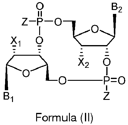 - a particular class of cyclic dinucleotides of Formula (I), (II) or (III) is when B 1 and B 2 are independently chosen from Adenine or Hypoxanthine.