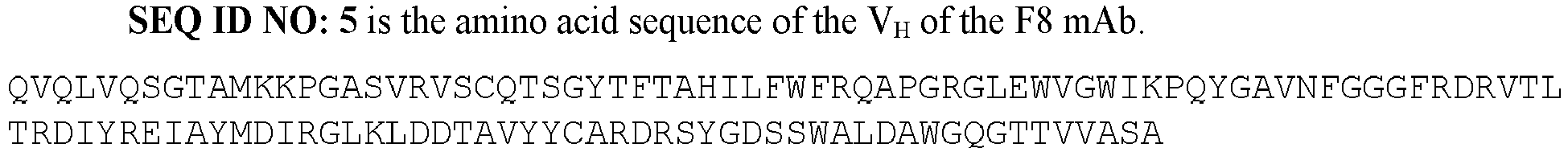 - the antibody or antigen binding fragment comprises a V H comprising a HCDR1, a HCDR2, and a HCDR3 of the V H set forth as SEQ ID NO: 5 (F8 V H ) and/or a V L comprising a LCDR1, a LCDR2, and a LCDR3 of the V L set forth as SEQ ID NO: 6 (F8 V H ).