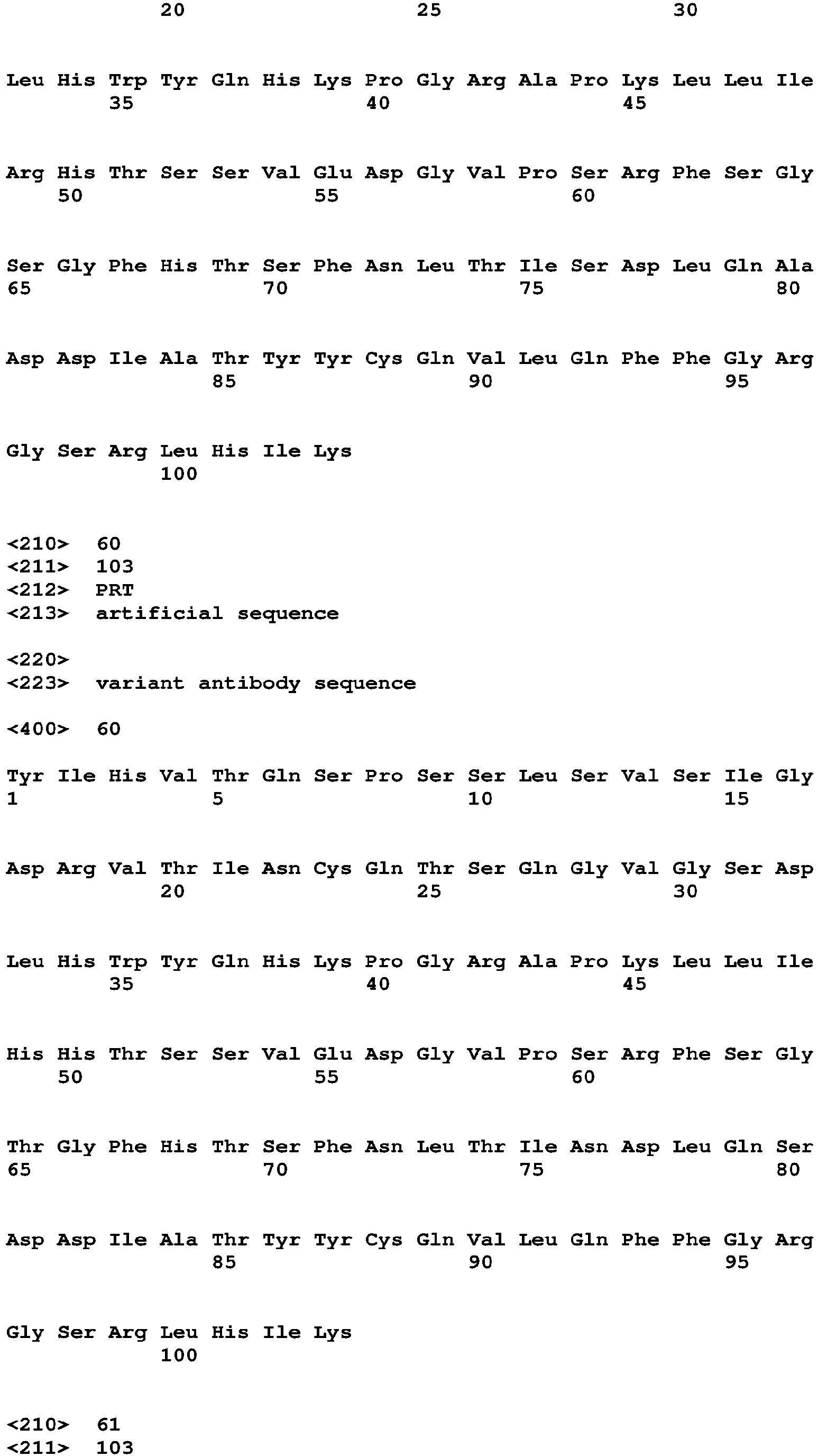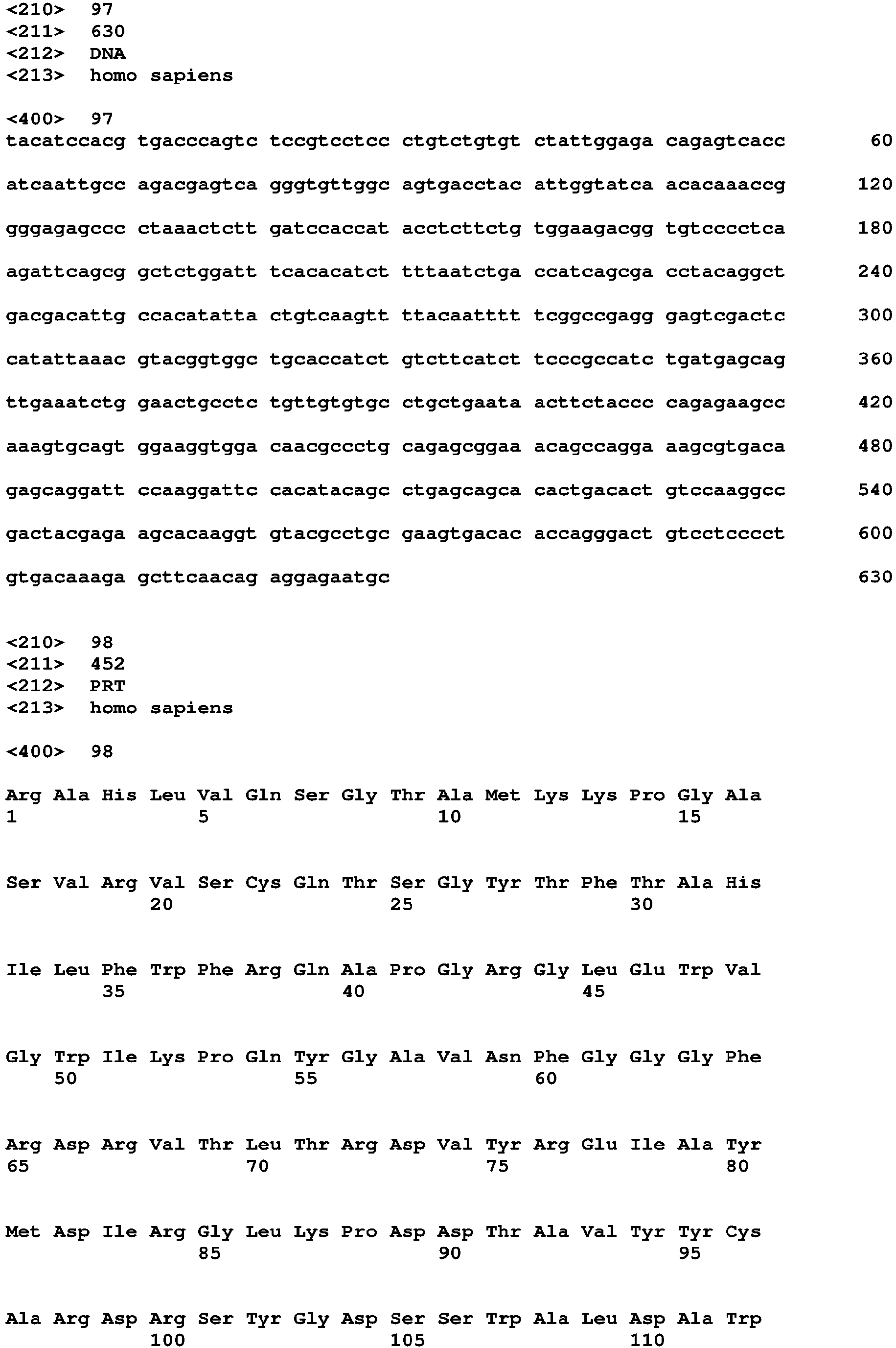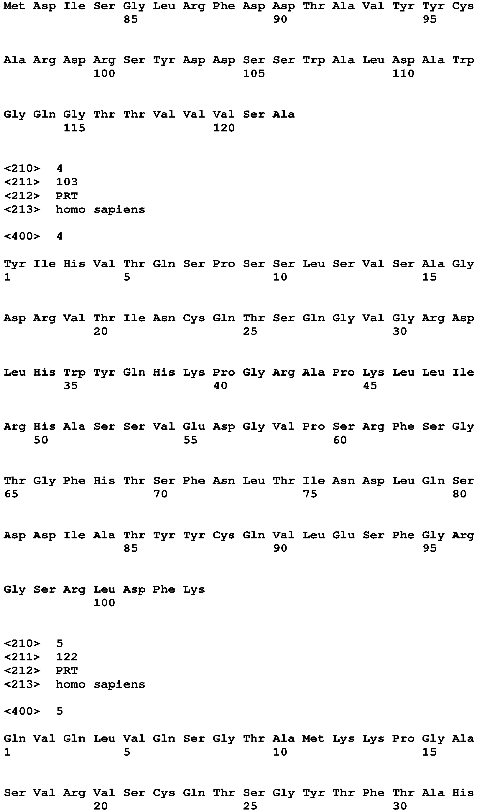 - nucleic and amino acid sequences listed in the accompanying sequence listing are shown using standard letter abbreviations for nucleotide bases, and three letter code for amino acids, as defined in 37 C.F.R. 1.822. Only one strand of each nucleic acid sequence is shown, but the complementary strand is understood as included by any reference to the displayed strand.