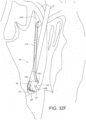 - the suturing device further has a first actuator coupled to the first needle and configured to rotate it from a retracted position, where the ferrule engaging tip of each of the one or more curved arms starts away from the one or more ferrule holders, through the tissue bite area, and to an engaged position where the ferrule engaging tip of each of the one or more curved arms is operationally aligned with the one or more ferrule holders.