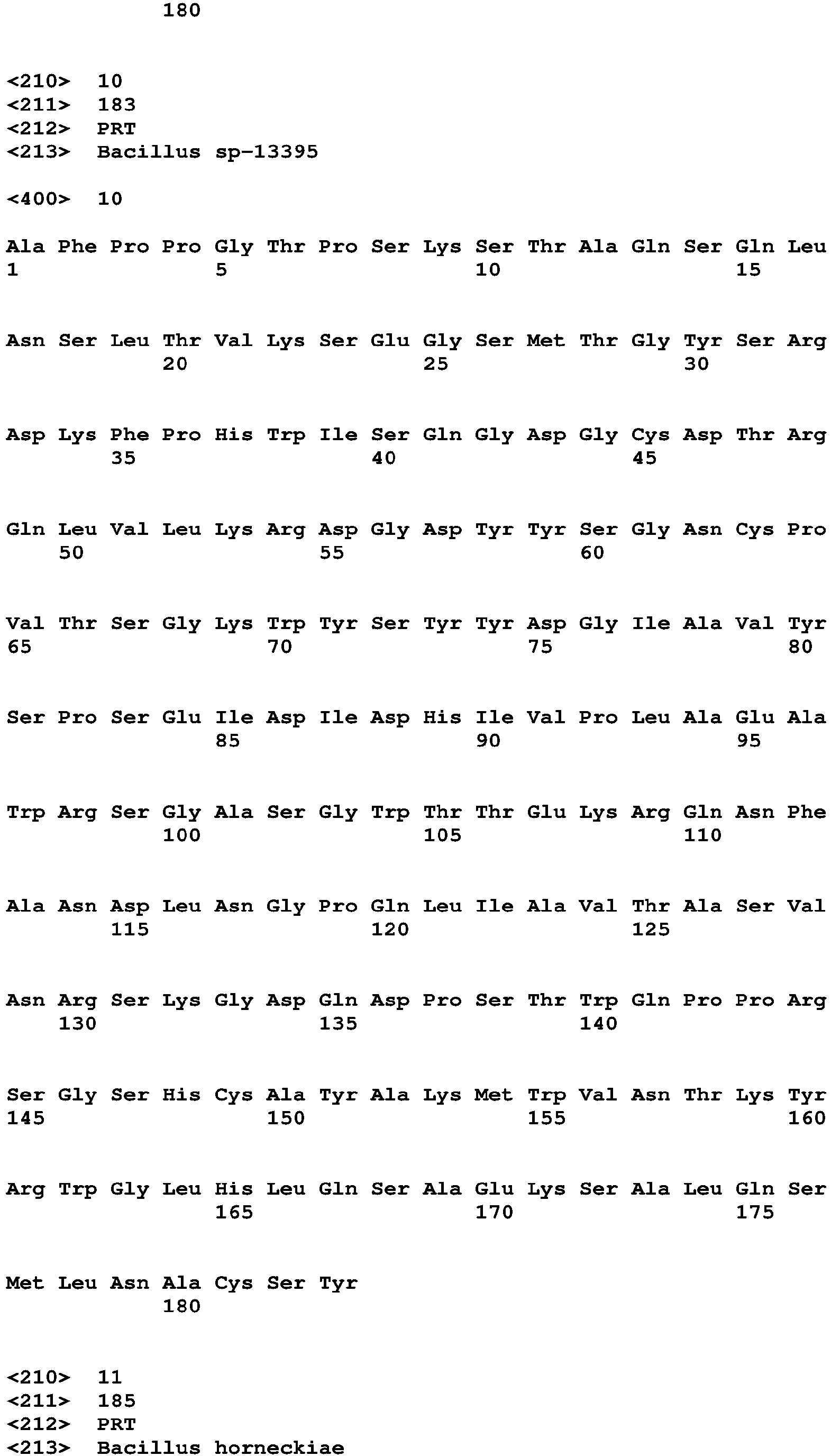 - the DNases to be added to a composition of the invention preferably belong to the group of DNases comprised in the GYS-clade, which are NUC1 and NUC1_A DNases further comprising the conservative motifs [D/M/L][S/T]GYSR[D/N] (SEQ ID NO: 73) and/or ASXNRSKG (SEQ ID NO: 74) and which share similar structural and functional properties.