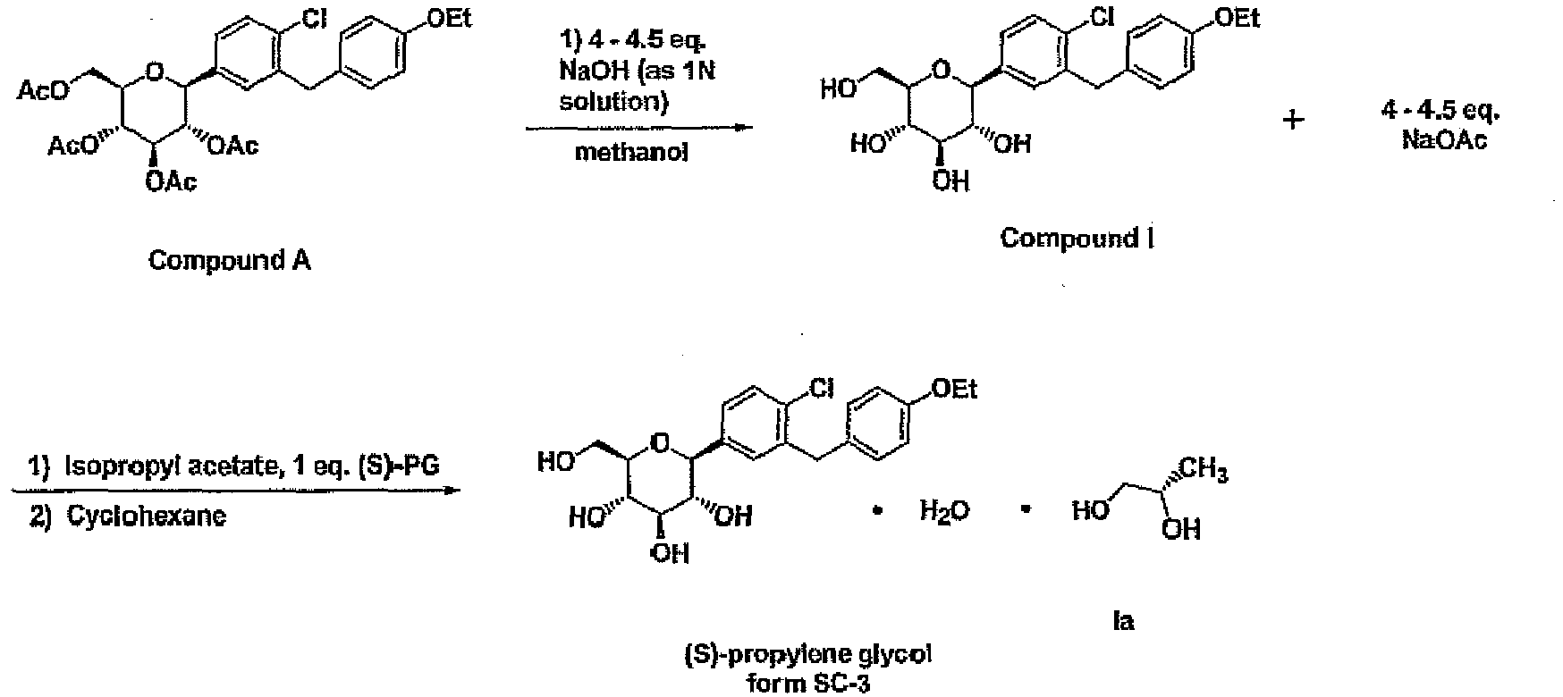 - the dapagliflozin is in the form of its (S)-propylene glycol ((S)-PG) hydrate (SC-3) which is shown as Compound (Ia) the preparation for which is disclosed in U.S. Application Serial No. 11/765,481, filed June 28, 2007 , U.S. Publication No. 2008-0004336 A1 , and Provisional Application No. 60/817,118, filed June 28, 2006 , the disclosures of both of which are incorporated herein by reference in their entireties.