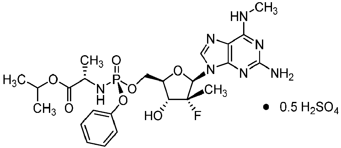 - Compound 2 is referred to as the hemi-sulfate salt of isopropyl(( S )-(((2 R ,3 R ,4 R ,5 R )-5-(2-amino-6-(methylamino)-9 H -purin-9-yl)-4-fluoro-3-hydroxy-4-methyltetrahydrofuran-2-yl)methoxy)(phenoxy)phosphoryl)- L -alaninate.