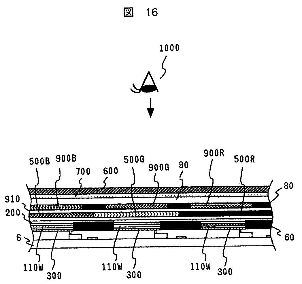 As shown in FIG. 16, the present display device is different from the above-described embodiment described with reference to FIG. 11 in that all the organic layers patterned in R, G, and B are changed to white light-emitting organic layers 110W. A color filter 900R, 900G, 900B that transmits light corresponding to R, G, B is pattern-formed between the substrate 90 and the polarization separating means 500.